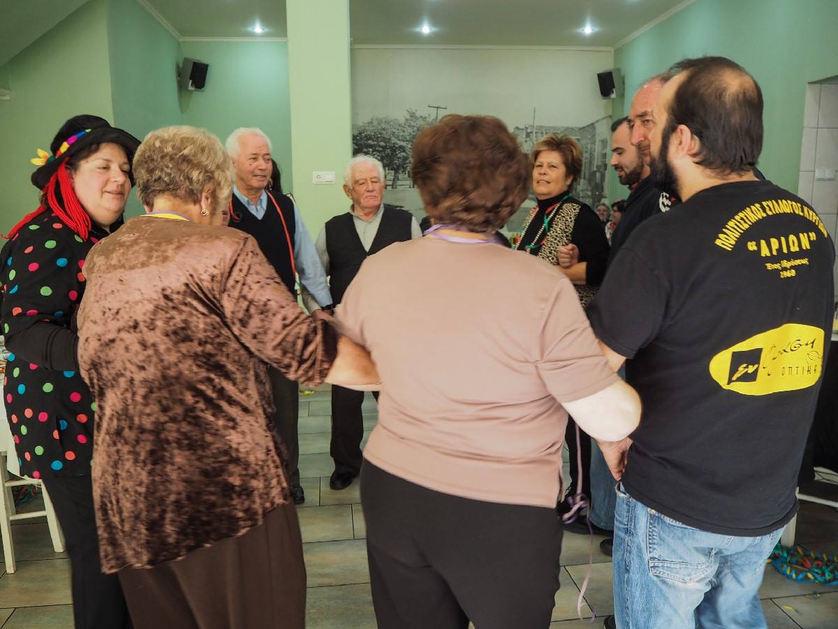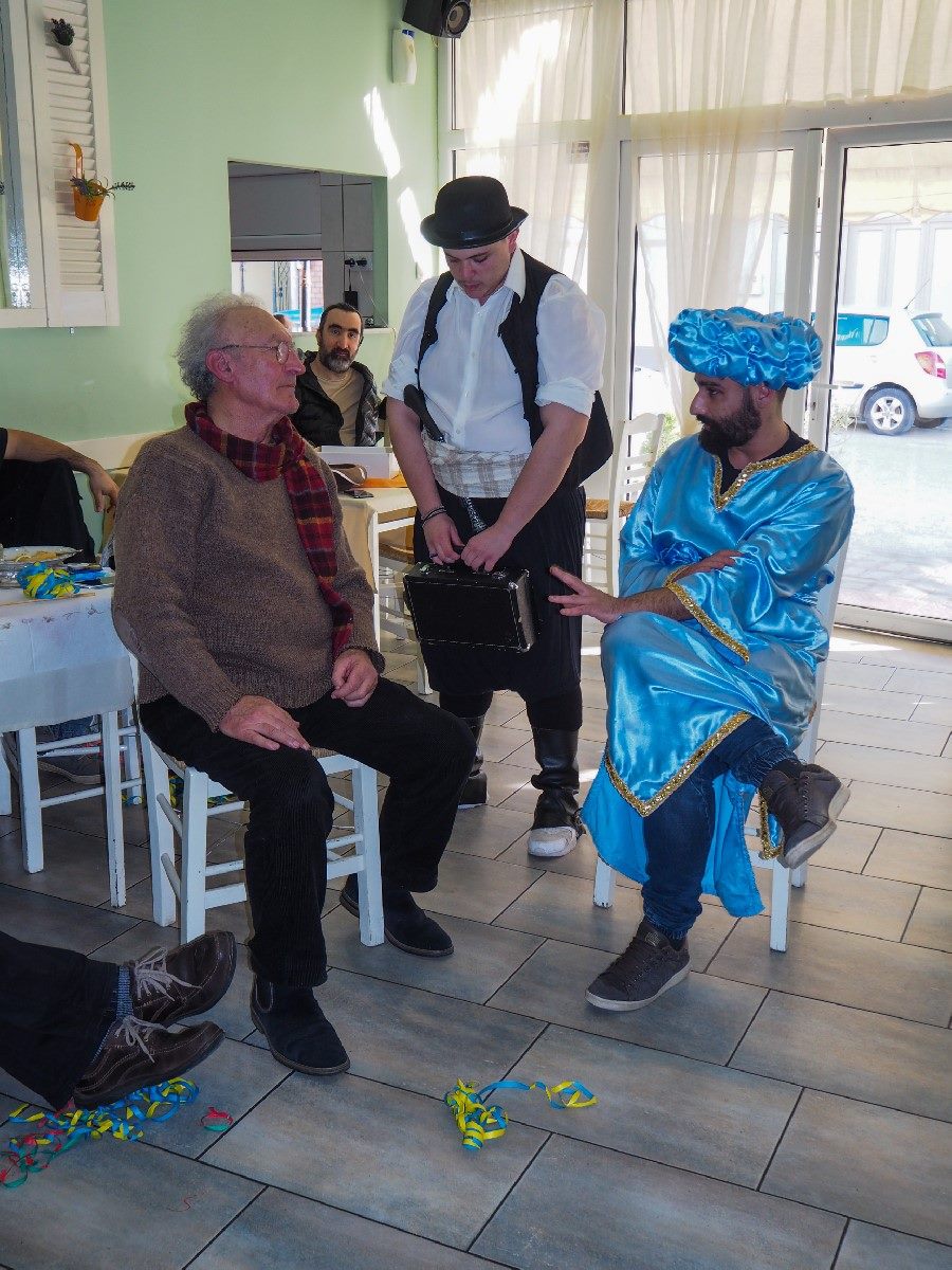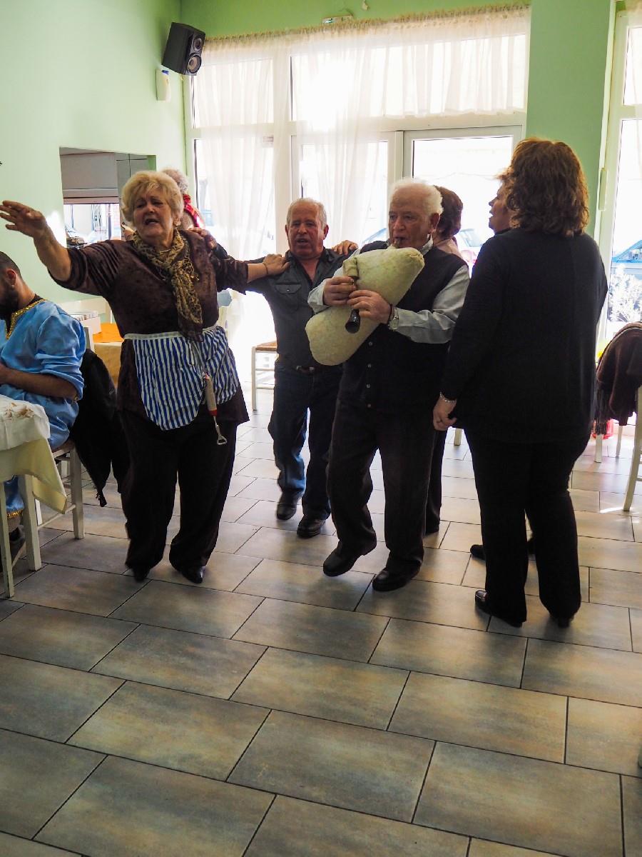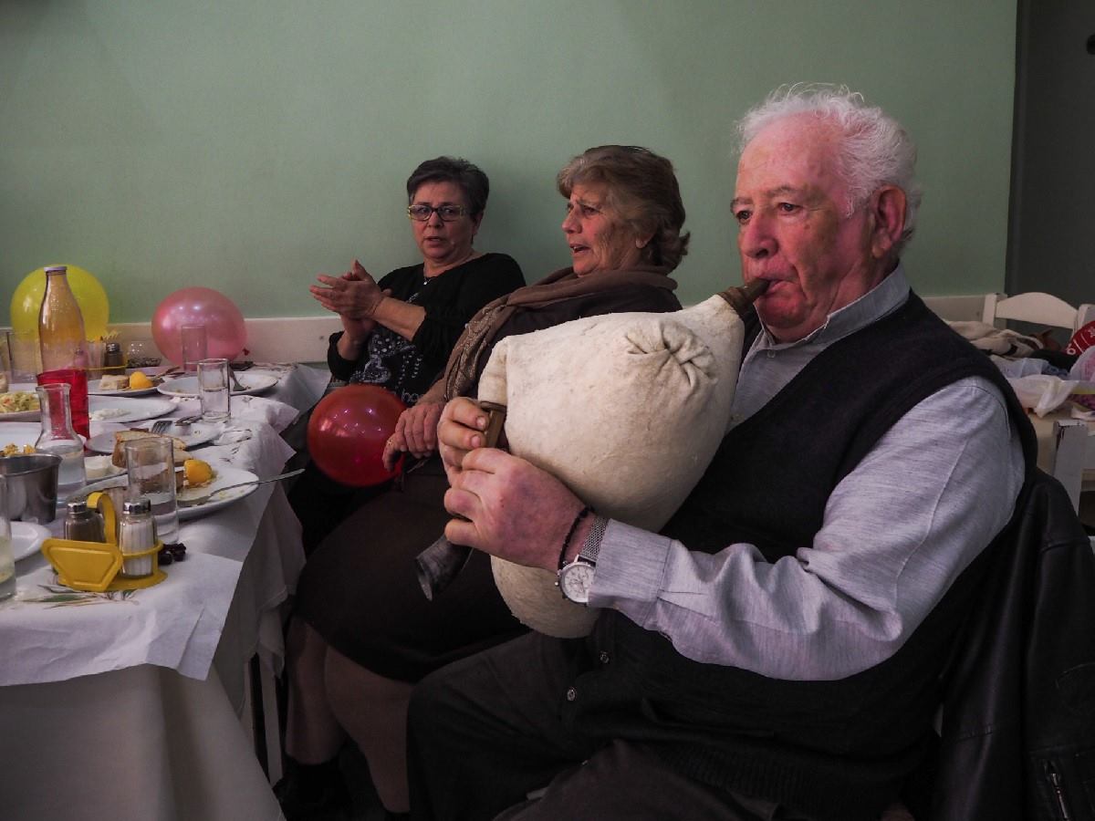 Ο κ. Γιάννης Κακαγιάννης, ίσως ο παλαιότερος και σίγουρα ο μεγαλύτερος σε ηλικία Κυργιώτης  τσαμπουνιέρης,  μας χάρισε την μαεστρία του, την εμπειρία και την διάθεσή του,…. «ωσάν μικρό παιδί». Ο αδερφός του ο Κώστας στο τραγούδι τον συνόδεψε, όπως  και μερικά ακόμη «μικρά παιδιά», τραγουδώντας και χορεύοντας τα πιπεράτα Σωκιανίδικα, σκωπτικά από την Μ.Ασία τραγούδια της Αποκριάς και έκαναν τα μάγουλά μας να «κοκκινίσουν»! Στην προσπάθειά μας να τα τραγουδήσουμε και να τα χορέψουμε και μεις, υπήρξαν πολλά αστεία στιγμιότυπα, που ο φακός της Βούλας και της Μαρίας τα αποθανάτισε!!!!!!